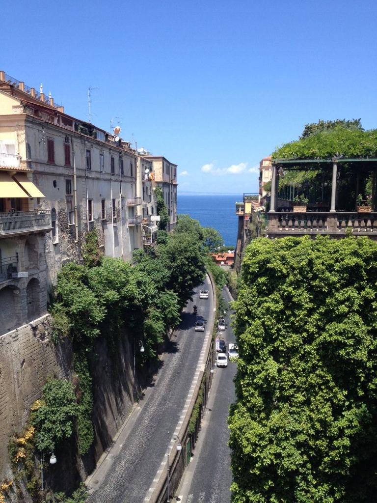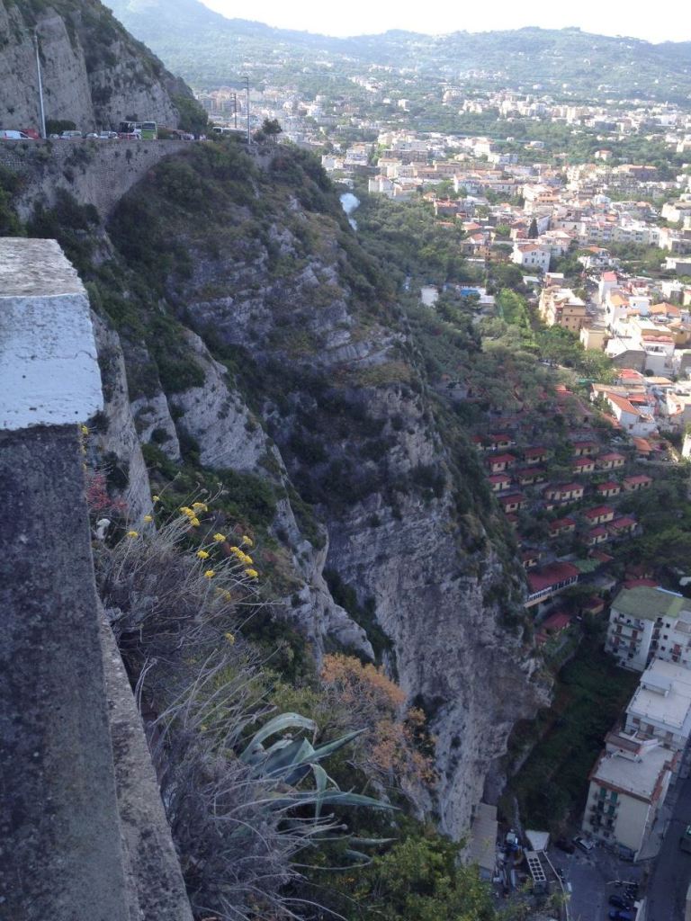 After eating breakfast, we met up with our tour group and hopped on board our bus for the day ahead. The first part of the excursion was an approximately 1.5 hour ride along the coast to Sorrento. Our bus stopped a few times along the way for some amazing photo ops. The mountainside cliffs just drop off right to the coast.